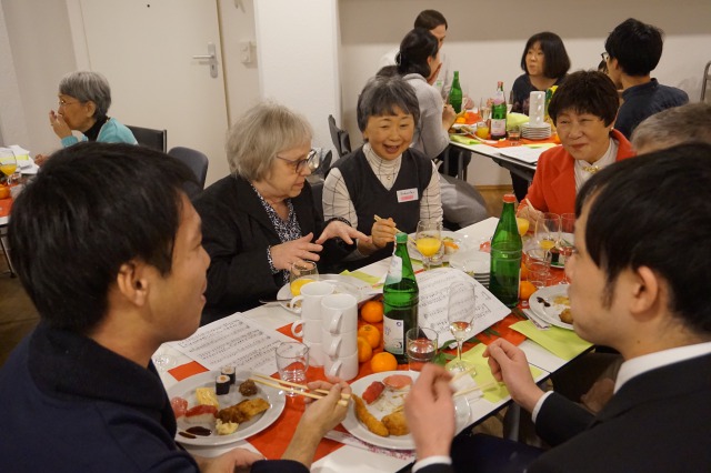 会員と会員の家族/同伴者とともに日頃竹を支援してくださっている方々12名お招きし、新しい年を祝いました。テーブルの上には折り紙のイノシシも一緒に。会長とディアコニー所長クール氏の挨拶の後、日本のお正月の歌を歌い、ケイタリ…