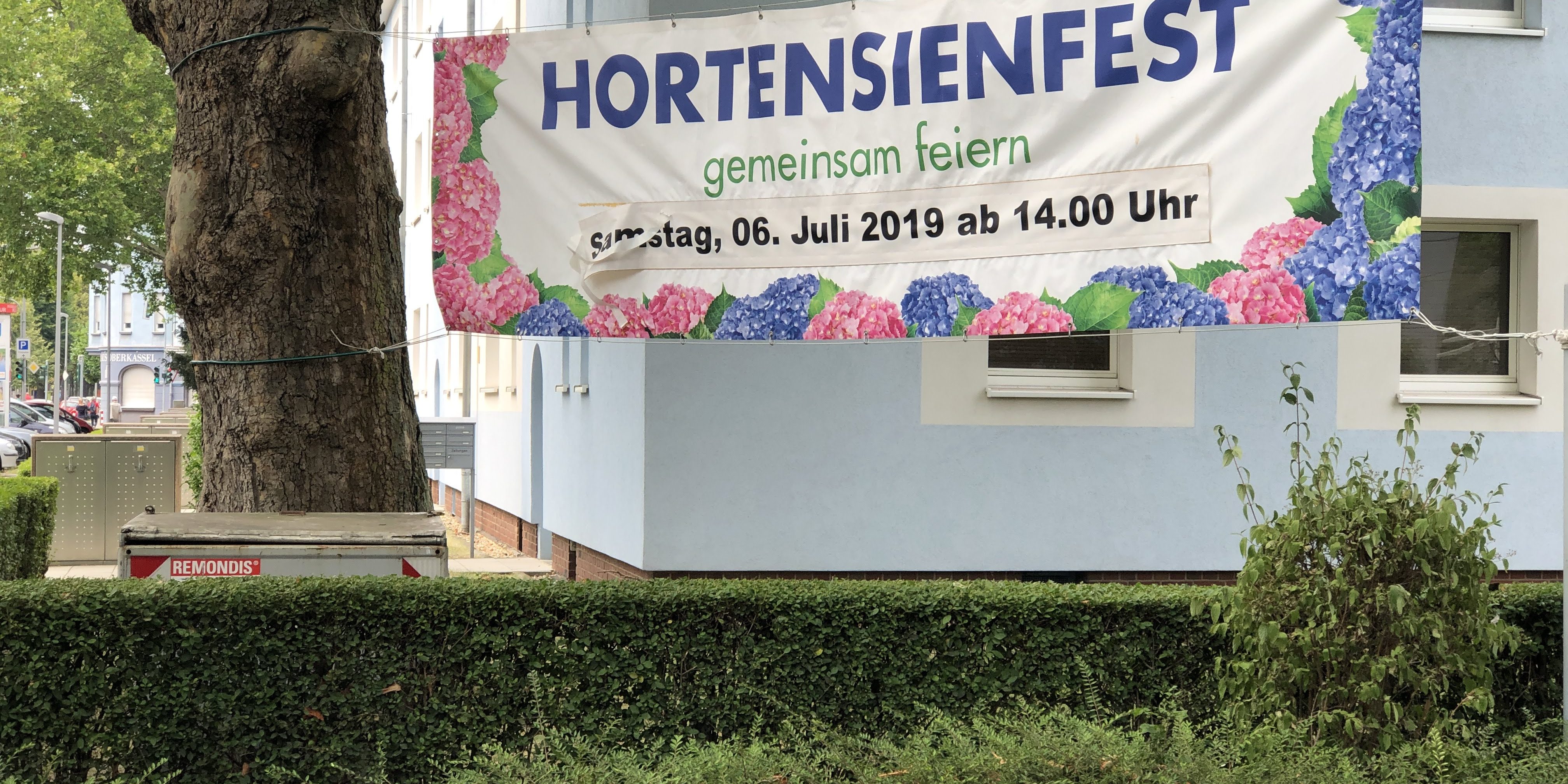 2019年7月6日 14時、第10回あじさい祭りはお天気に恵まれ、爽やかな青空の下にデュッセルドルフの狩猟ホルンクラブのファンファーレ演奏で開始された。