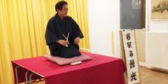 和服と 扇子を持っていらっしゃる高座のかたは 校長 先生。座布団に 座られて 話し始めました。