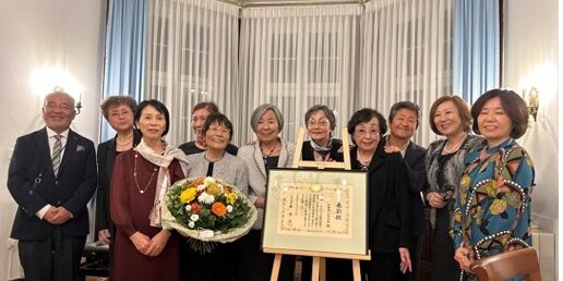 Nach der Begrüßung durch die Generalkonsulin beglückwünschte Rolf Tups, Bezirksbürgermeister in Düsseldorf, die Mitglieder von TAKENOKAI in seiner Laudatio. Insbesondere die ehemalige Vorstandsvertreterin Yoko Ophei-Saito, die die Gesellschaft seit ihrer Gründung bis zum vergangenen Jahr vertrat, und die derzeitige Vorstandsvertreterin Akiko Asai-Berger, die diese Aufgabe 2023 übernommen hat, wurden für ihren Einsatz geehrt. Zunächst wurde die Urkunde zusammen mit einem Blumenstrauß offiziell überreicht. Es folgte eine Gesangsdarbietung von Herrn Takao Hoshino, begleitet von Frau Satsuki Wakabayashi am Klavier. Beide Musiker unterrichten bei der Japanischen Internationalen Schule und betreuen insbesondere den TAKE-Chor. Herr Wienss, ehemaliger Leiter des Altenzentrums der Diakonie Oberkassel und seit Gründung von TAKENOKAI langjähriger Unterstützer des Vereins, sprach zum Abschluss der Überreichungszeremonie einen Toast. Auch nach dem offiziellen Teil der Veranstaltung waren zahlreiche Gäste anwesend und unterhielten sich angeregt , wobei sie Erinnerungen und Erfahrungen austauschten und über Zukunftsperspektiven des Vereins sprachen. Ein spontaner Gesangsbeitrag der Mitglieder von TAKENOKAI mit einem nostalgischen Lied trug zu einer warmen und herzlichen Atmosphäre vor Ort bei.